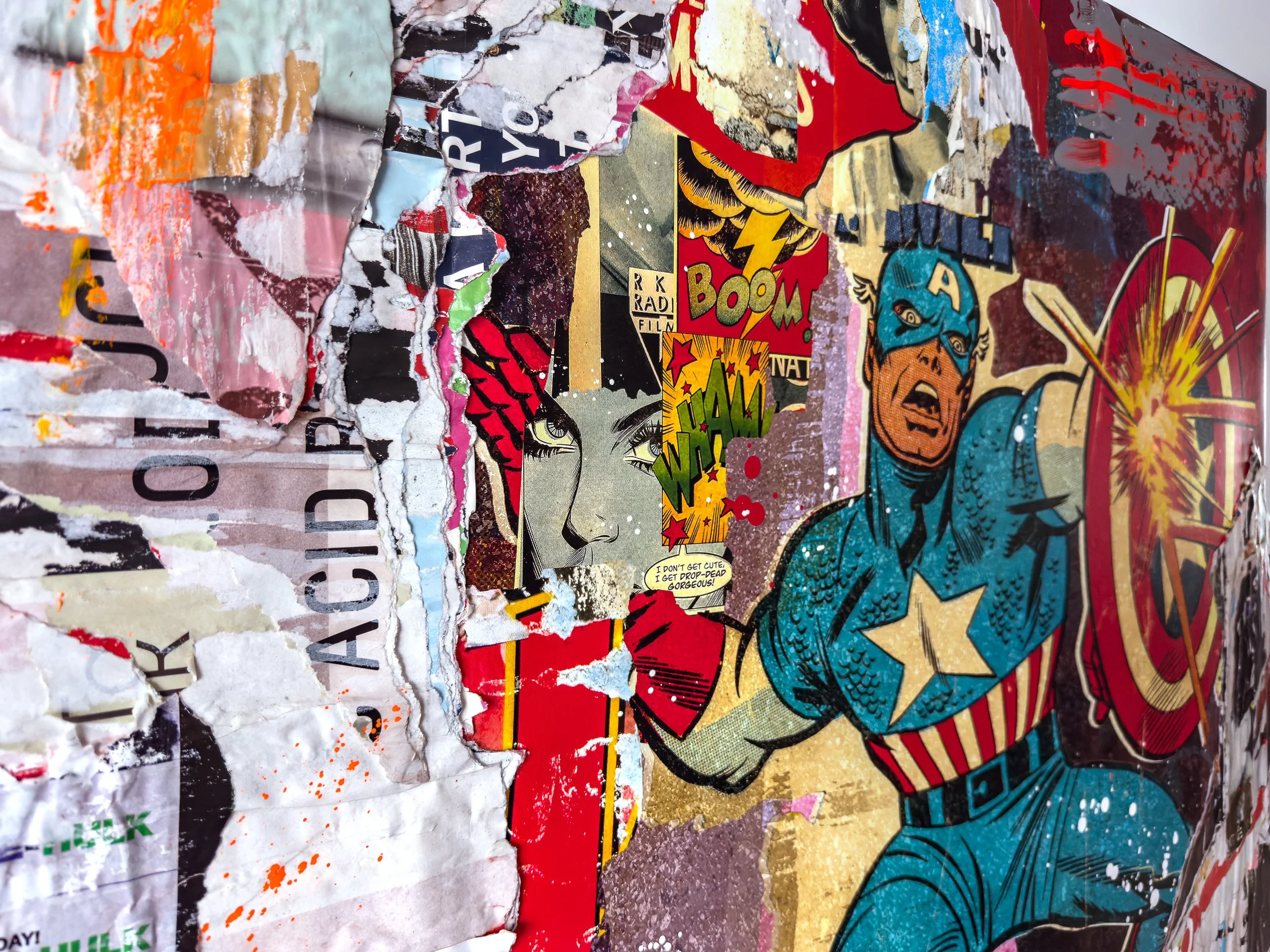 “BOOM” 2026. 52.5”X55” MIXED MEDIA CANVAS. pigment, appropriated street posters, acrylic paint, SPRAY PAINT, GLUE, VARNISH