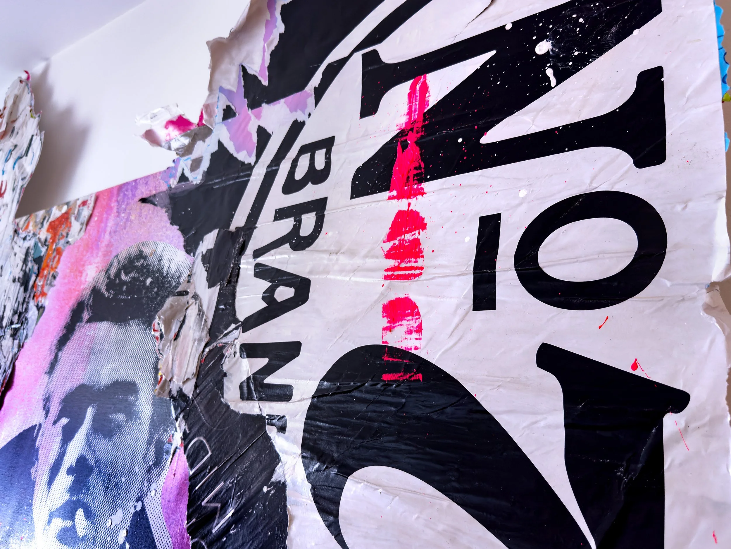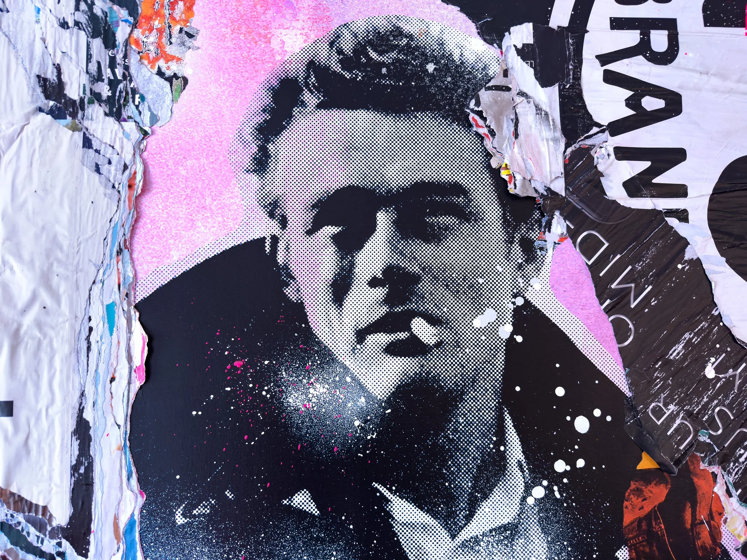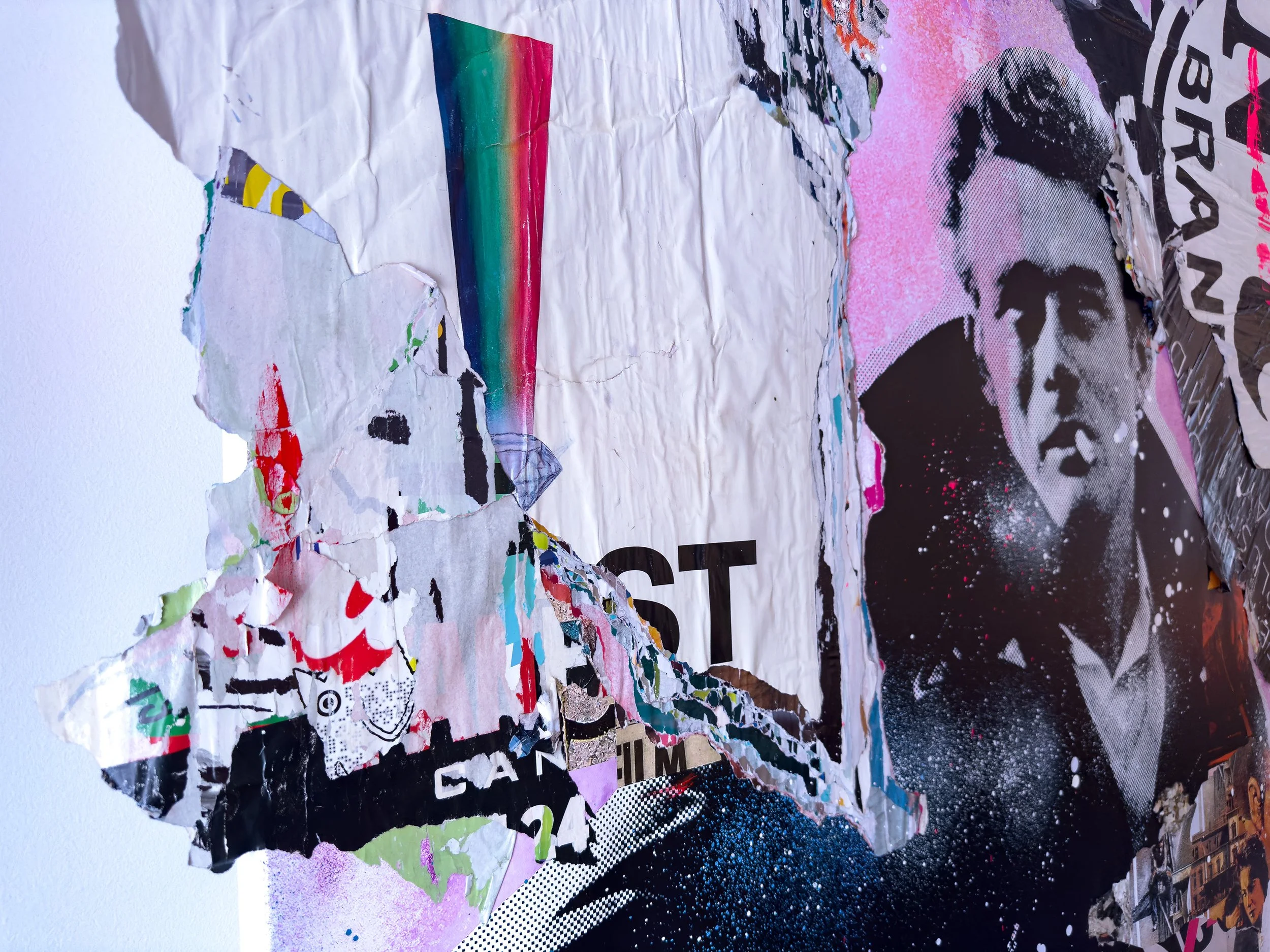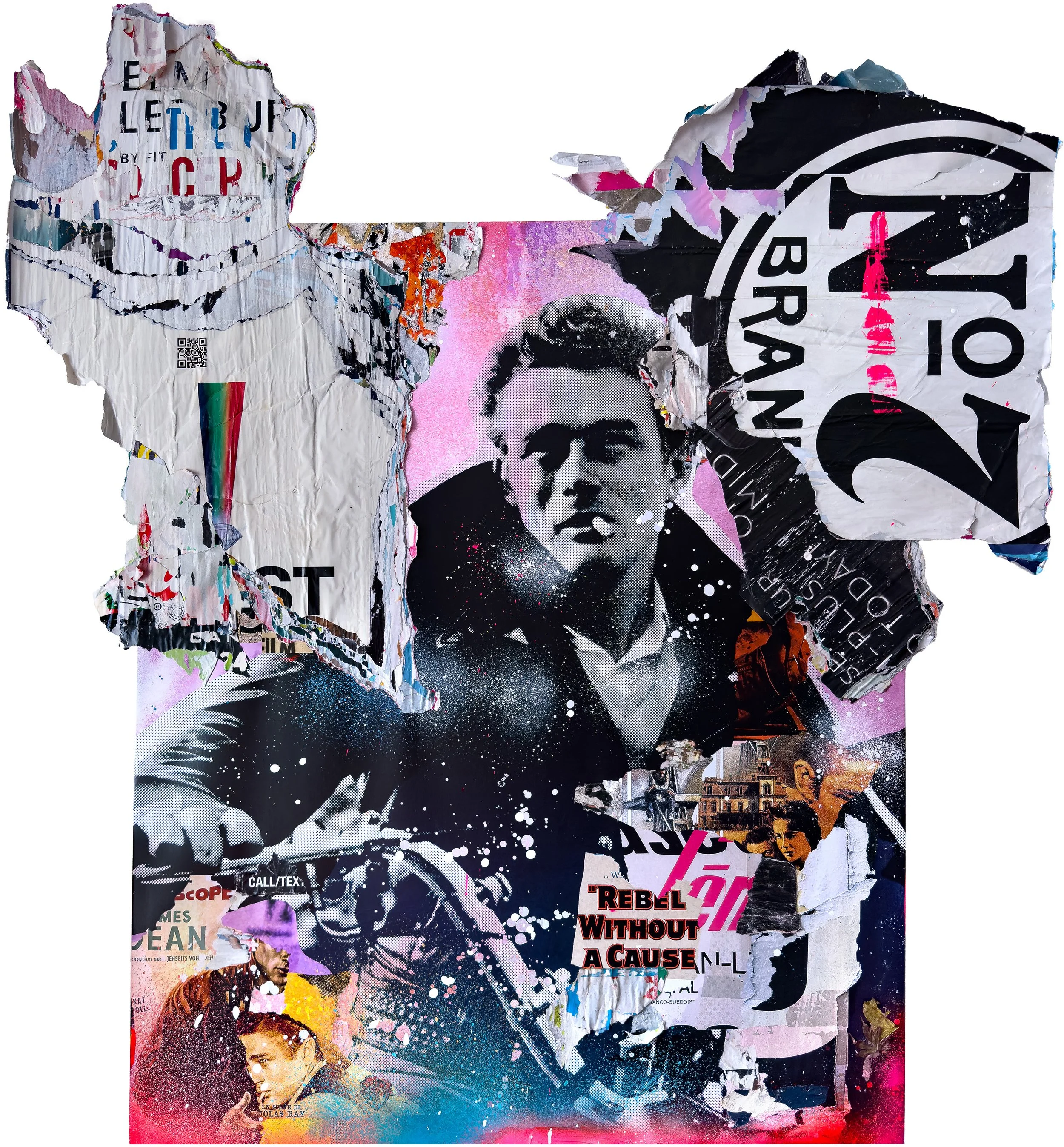 “JAMES DEAN” 2026. 75”X68” MIXED MEDIA CANVAS. pigment, appropriated street posters, acrylic paint, SPRAY PAINT, GLUE, VARNISH