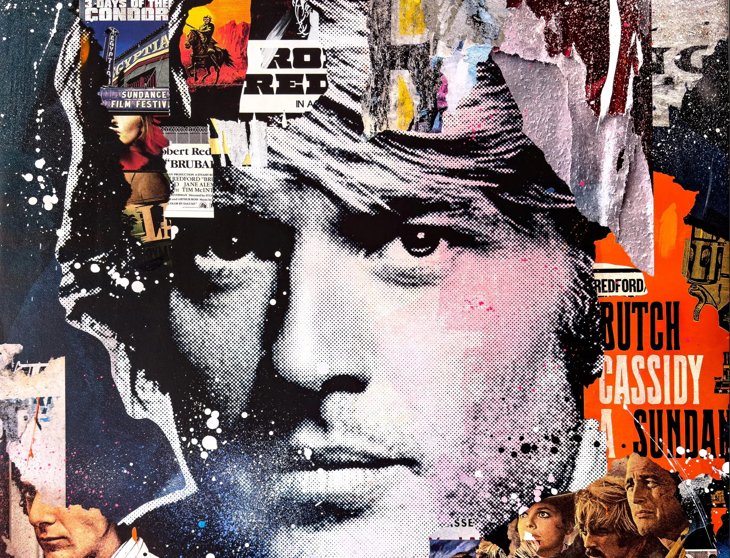 “Redford” 2026. 60”X50” MIXED MEDIA CANVAS. pigment, acrylic paint, SPRAY PAINT, GLUE, VARNISH